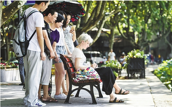 漫步北山街,Machi被一支秩序井然的队伍吸引,这是杭城市民们正在排队购买西湖莲蓬与荷叶。Machi在湖边一张长椅落座,静静地观察市民们的一举一动,不停用画笔记录着。一会工夫,一幅充满想象力的美图跃然纸上(见右下角)。