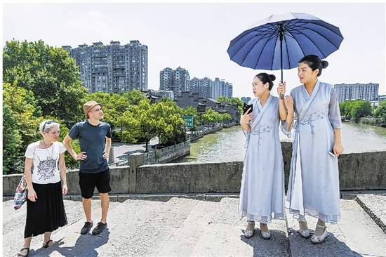 在拱宸桥上,古老的京杭大运河令Machi赞叹不已。桥上,Machi和男友试着用英文和两名身着古装的女孩交流,原来两名女孩是附近一个楼盘的销售员,因为销售的是中式风格楼盘,所以她们的工作服也格外中国风。