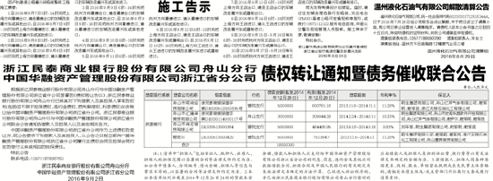 根据浙江民泰商业银行股份有限公司舟山分行与中国华融资产管理股份有限公司浙江省分公司签署的《债权转让协议》,浙江民泰商业银行股份有限公司舟山分行已将其对下列借款人及其担保人享有的权利(包括但不限于担保债权、违约金债权、损失赔偿权、利息债权)依法转让给中国华融资产管理股份有限公司浙江省分公司。浙江民泰商业银行股份有限公司舟山分行与中国华融资产管理股份有限公司浙江省分公司联合公告通知各借款人及担保人以及其他相关各方。