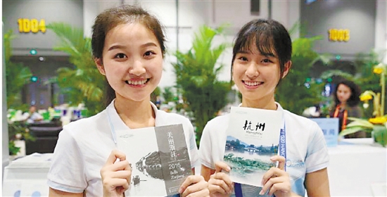 “小青荷”志愿者向媒体展示东道主形象画册。 记者 朱卫国 摄