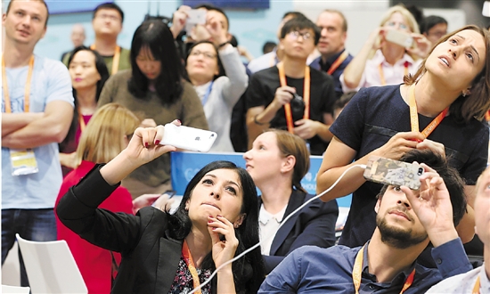 9月4日,在G20杭州峰会新闻中心,中外媒体记者收看峰会开幕式实况。 本报记者 徐斌 摄