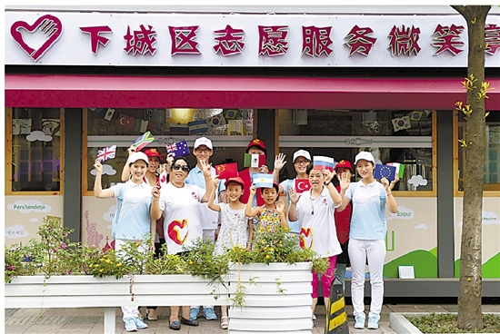 “小青荷”携手“武林大妈”在微笑亭前合影。