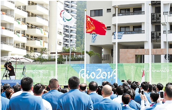 9月5日,里约残奥会中国体育代表团在里约残奥村举行升旗仪式。