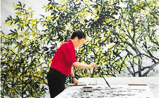 何水法在创作,背后是他的画作《春在江南》。