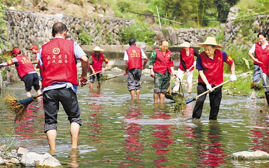 近日,桐庐县莪山畲族乡党员志愿者服务队在“护理”莪溪,清理水中垃圾,以实际行动美化家园,保护生态。
