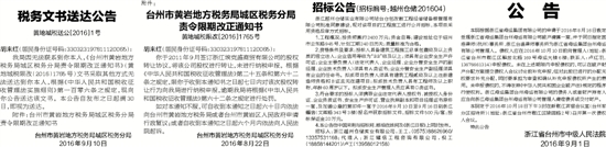 我局因无法联系到你本人,《台州市黄岩地方税务局城区税务分局责令限期改正通知书》(黄地城税限改〔2016〕1765号)文书采取其他方式无法送达到你本人,根据《中华人民共和国税收征收管理法实施细则》第一百零六条之规定,现向你公告送达该文书。本公告自发布之日起满30日,即视为送达。