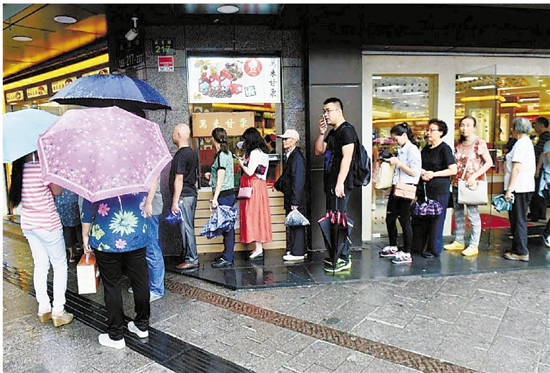 9月14日,顾客在杭州采芝斋排长队购买现烤鲜肉月饼。 龙巍 摄