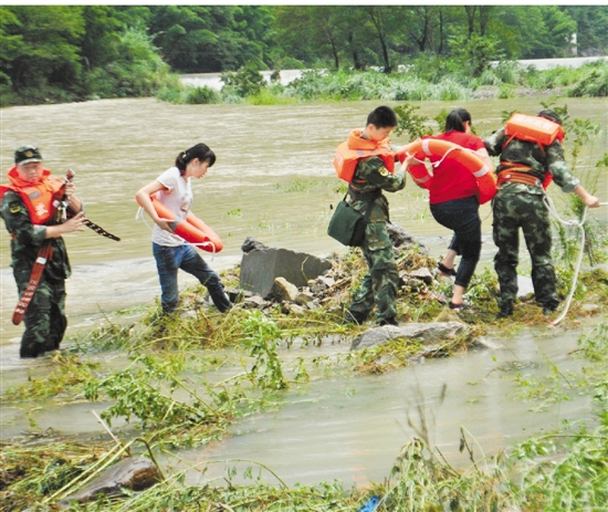 9月16日,温州瓯海区泽雅水库水位迅速上升,6位村民被困山上,武警温州支队三中队战士将村民成功救出。