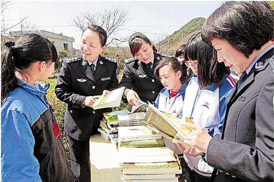 海曙公安分局户证办理中心党支部书记陆敏丽(左二)带领“十元爱心基金”团队为四明山中学送去爱心基金和书籍。 通讯员 张亦斌 摄
