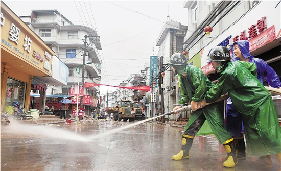 在台风“莫兰蒂”中受灾严重的泰顺县三魁镇,消防官兵和群众正在清洗街道,争取早日恢复正常生活。 本报记者 胡元勇 摄