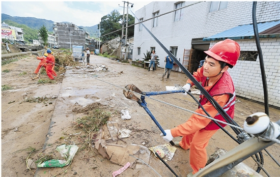 在泰顺县雅阳镇沐峰村,电力工人正在开展灾后抢险。 黄周虎 李金辉 摄