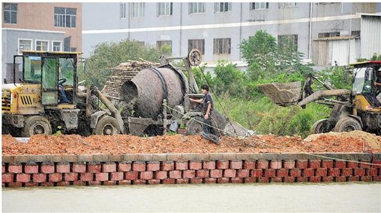 9月17日,玉环县龙溪镇斩港河畔,工人们正在雨中加固堤岸,防御台风带来的强降雨。 詹智 摄