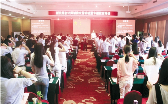 | 立诚信之言 树行业之风 浙江省注册会计师协会、资产评估协会每年开展新注册人员诚信宣誓活动。新批准注册人员庄严宣誓,并在宣誓签名簿上郑重签名,有效增强注册会计师和资产评估师职业荣誉和责任感,深入推进行业诚信建设。五年来,约3000名新注册人员参加诚信宣誓教育活动。 |