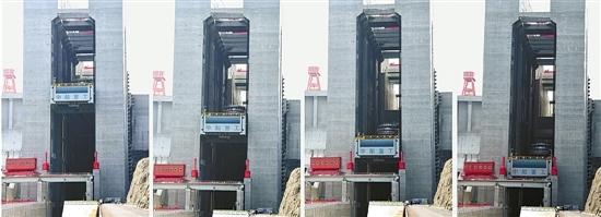 图为三峡升船机承船厢载着游轮缓缓下降(拼版照片)。