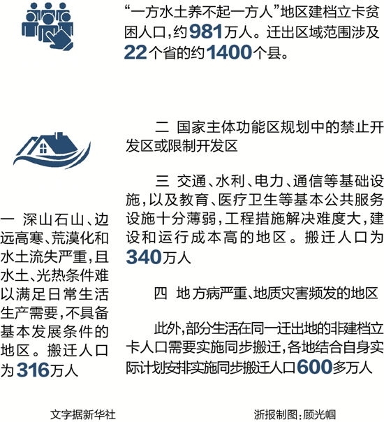 “一方水土养不起一方人”地区建档立卡贫困人口,约981万人。迁出区域范围涉及22个省的约1400个县。