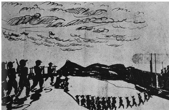 黄镇画的展现红军过湘江的漫画。 新华社发