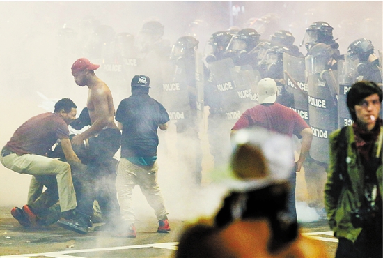 9月21日,在美国北卡罗来纳州夏洛特市,示威者在催泪弹烟雾中与警察对峙。 新华社发