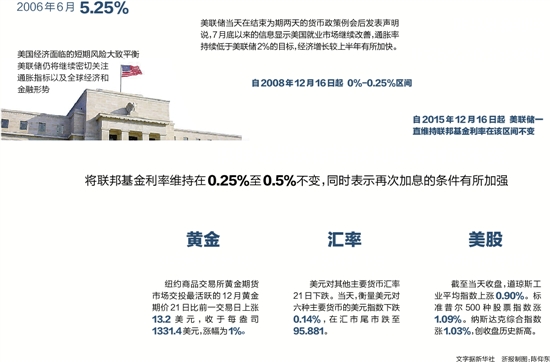 将联邦基金利率维持在0.25%至0.5%不变,同时表示再次加息的条件有所加强