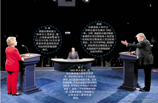 今年美国总统候选人共举行三场辩论,第二、三场电视辩论将于10月9日和19日在密苏里州圣路易斯和内华达州拉斯维加斯举行。
