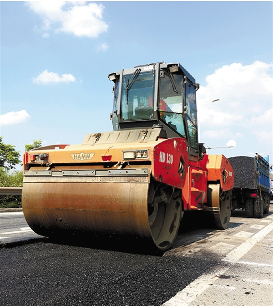 318国道长兴段公路养护工正在施工