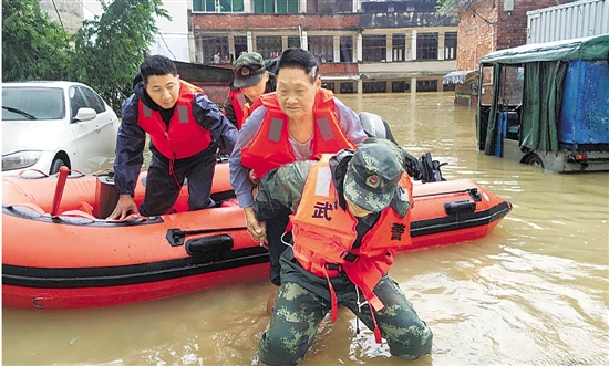 29日,平阳县水头镇,武警官兵转移受困老人。 通讯员 厉慧 项琦 本报记者 李震宇 摄