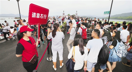 10月4日,在游人如潮的断桥边,志愿者们手持指示牌疏导游人。
