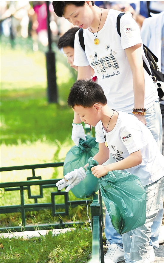 一位家长带着孩子在西湖边捡垃圾,做起了临时志愿者。