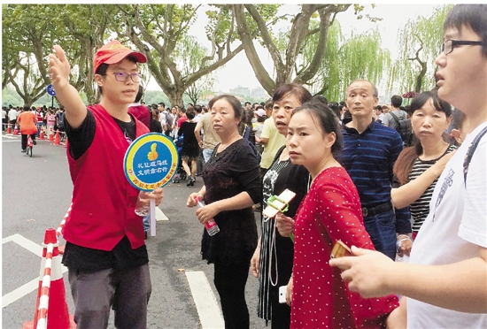 10月3日,来自浙江大学的学生志愿者在西湖景区为游客服务。