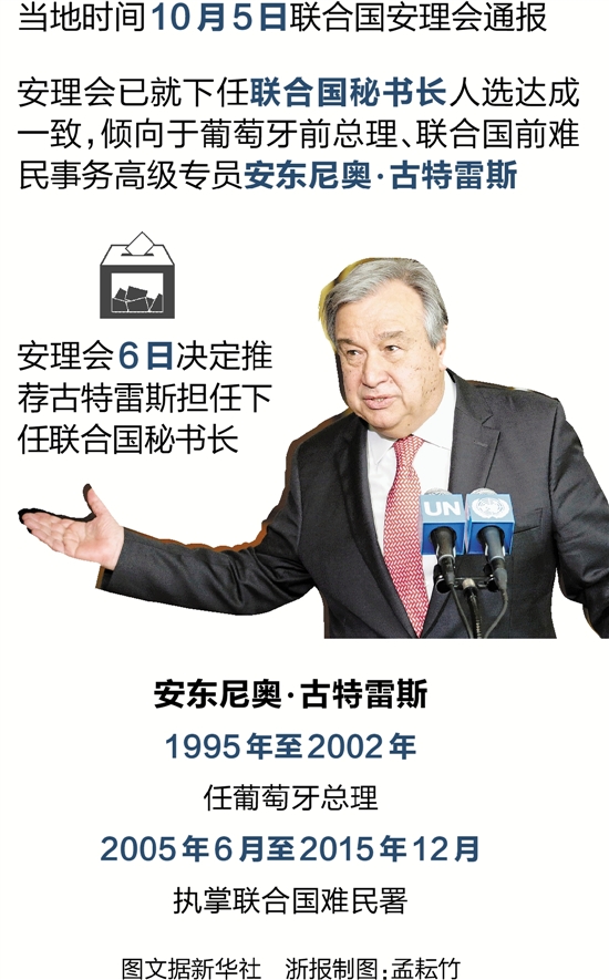 安理会已就下任联合国秘书长人选达成一致,倾向于葡萄牙前总理、联合国前难民事务高级专员安东尼奥·古特雷斯