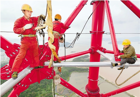 10月6日,浙江送变电工人在舟山市岱山输电线路改造工程灌门大跨越K11高塔上进行最后的固件安装。