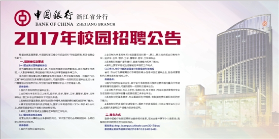 根据业务发展需要,中国银行浙江省分行启动2017年校园招聘,相关信息公告如下: