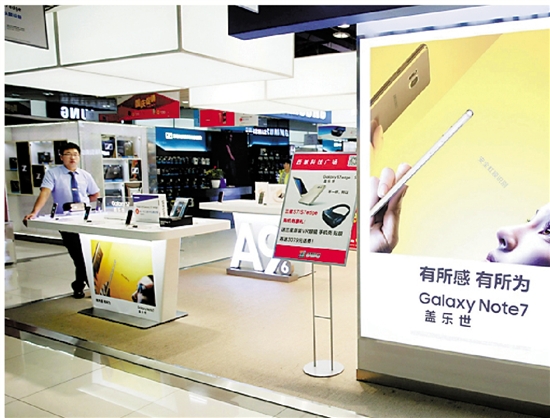 这是10月12日在北京一家三星手机体验店内拍摄的三星盖乐世Note7手机广告牌。 新华社发
