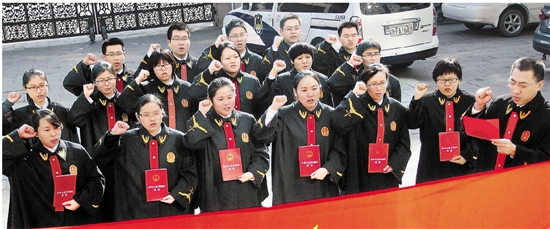 嘉善法院的审判员、助理审判员手握《宪法》,庄严宣誓。(本报资料图片)