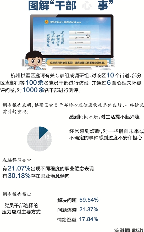 杭州拱墅区邀请有关专家组成调研组,对该区10个街道、部分区直部门等100余名党员干部进行访谈,并通过6套心理关怀测评问卷,对1000余名干部进行测评。