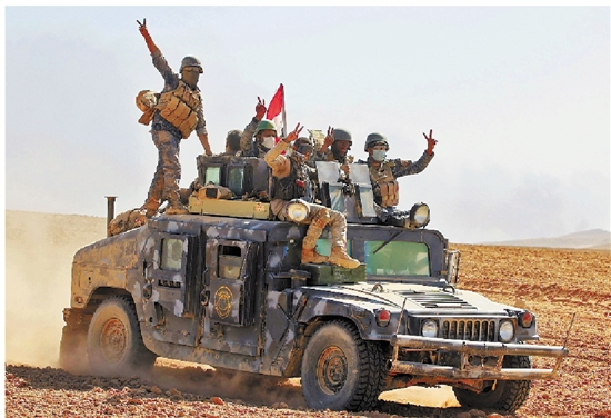 10月20日,伊拉克政府军士兵乘车向底格里斯河东岸的一座村庄进发时打出“胜利”的手势。 新华社发