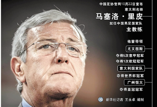 新华社北京10月22日电 (记者 公兵 王浩明 王浩宇) 中国足协官网22日宣布,意大利名帅马塞洛·里皮就任中国男足国家队主教练。