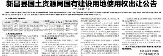 根据《中华人民共和国土地管理法》《中华人民共和国城镇国有土地使用权出让和转让暂行条例》及国土资源部第39号令《招标拍卖挂牌出让国有建设用地使用权规定》等法律法规及行政规章规定,经新昌县人民政府批准,我局决定于2016年11月16日上午10时,在新昌县公共资源交易中心大厅公开拍卖(挂牌)出让国有建设用地使用权,现将有关事项公告如下: