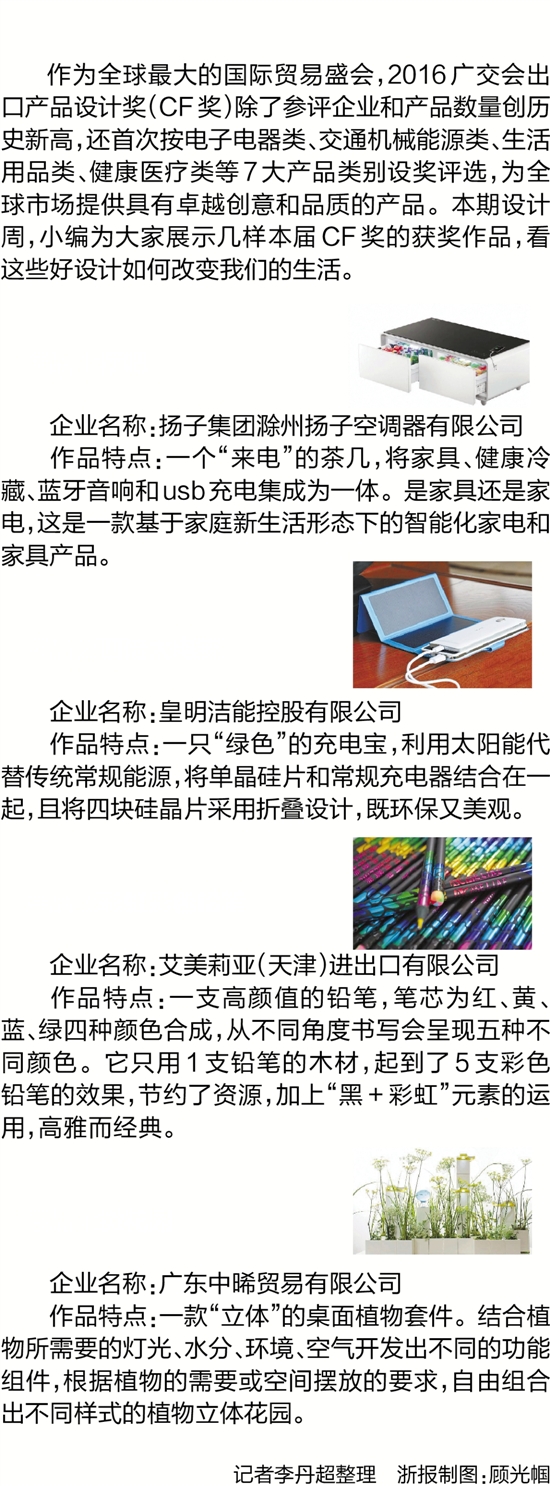 作为全球最大的国际贸易盛会,2016广交会出口产品设计奖(CF奖)除了参评企业和产品数量创历史新高,还首次按电子电器类、交通机械能源类、生活用品类、健康医疗类等7大产品类别设奖评选,为全球市场提供具有卓越创意和品质的产品。本期设计周,小编为大家展示几样本届CF奖的获奖作品,看这些好设计如何改变我们的生活。