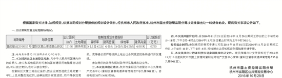 五、本次挂牌出让的详细资料请参阅挂牌出让文件。有关挂牌出让文件资料可于2016年11月16日起到杭州市国土资源局富阳分局地产交易中心索取(富阳区富春街道体育馆路237号九楼901室)。