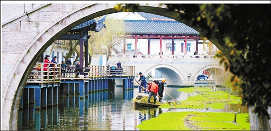 五水共治,为水生植物“脱棉袄”。 何雯 摄