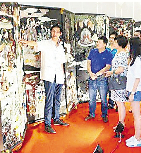 王银华(左一)向观众介绍作品《黄大仙》。