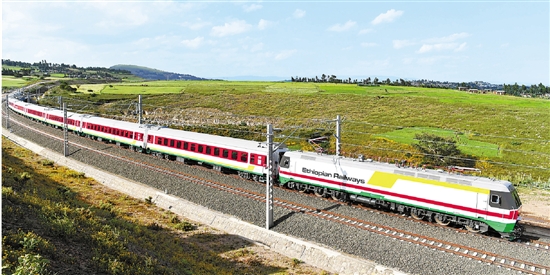 在埃塞俄比亚首都亚的斯亚贝巴附近,列车在亚吉铁路上行驶。 新华社发