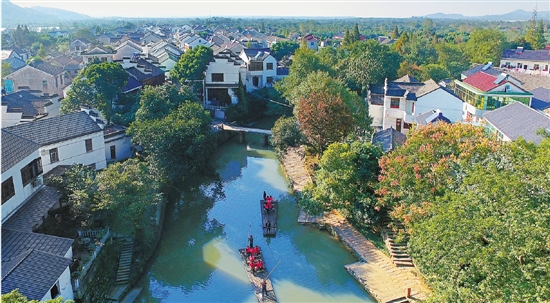 日前,在长兴县泗安镇上泗安村绿树掩映的古河道上,游客们正坐在竹筏上漂流,欣赏两岸美景。据悉,为发掘上泗安村古村落的人文底蕴、建设最美河道,当地进行了全方位的生态治理。