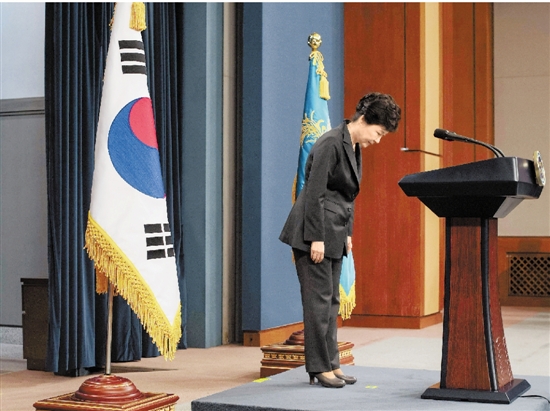 11月4日,在韩国首尔青瓦台总统府,韩国总统朴槿惠在发表讲话前鞠躬。 新华社发