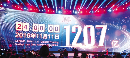 截至11月11日24时,“2016天猫双11全球狂欢节”总交易额1207亿元,覆盖235个国家和地区。 本报记者 魏志阳 摄
