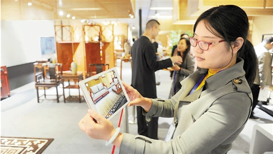 近日,第十一届中国(东阳)木雕竹编工艺美术博览会现场,工作人员在给参观者演示用AR技术虚拟布置家居。