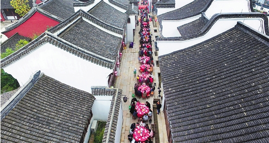 11月19日,海宁南关厢历史街区举办百家宴,400多位居民在这里品尝特色美食,共话邻里情缘。