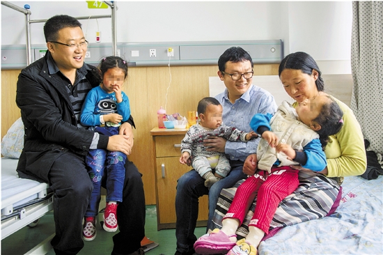 11月21日,在浙江援藏干部的陪伴下,曲增(右一)和她的孩子们在浙大儿院,准备接受专家会诊。 本报记者 李震宇 摄