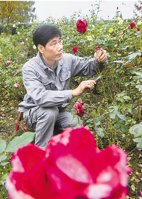 月季栽培养护技能大师工作室领衔人华玉强正在给月季修枝。目前花圃拥有100多个月季品种,色彩斑斓的花海吸引了许多游人。