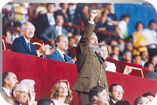 1992年7月25日巴塞罗那奥运会开幕式上,菲德尔·卡斯特罗向古巴体育代表团握拳致意。 新华社发